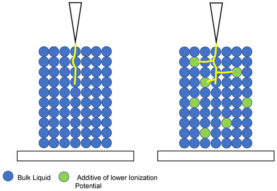 It has been demonstrated that additives can be used to change the streamer propagation velocity and acceleration threshold of base liquids, including cyclohexane, medical white oils, and ester liquids [8,9,35,36]. It has also been found that if the additive has an ionisation potential (IP) lower than that of the base liquid, a streamer velocity slowing effect can be expected [36]. The postulation is that additives of lower IP values slow down the streamer by increasing the degree of streamer branching. This increased branching leads to shielding effects on the neighbouring tips, and consequently an overall reduction of the field stress at the streamer’s tips [11,35].