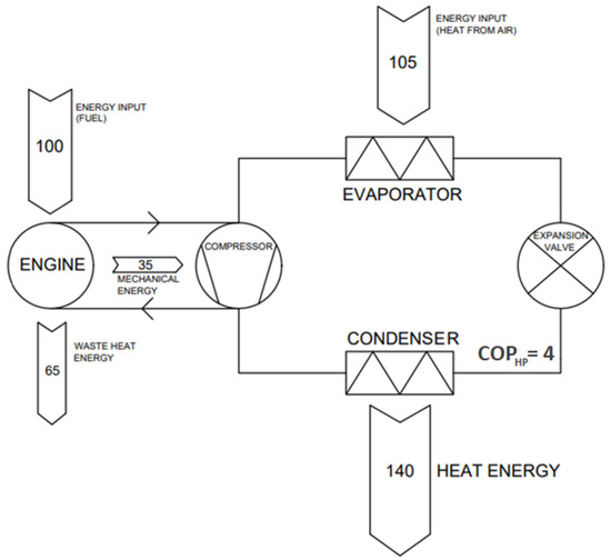 Schematic diagram of gas engine-driven heat pump energy flows.