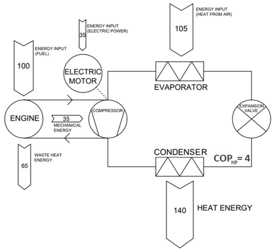A gas engine-driven heat pump is typically applied for heating or both cooling and heating. Due to the waste heat from the gas engine, the heating mode has a higher performance than the cooling mode in these devices. The research groups, striving to obtain the best possible energy, ecological and economic efficiency, subjected the devices to the analysis of a number of systems, including the GEHP. One of them is the hybrid gas engine heat pump (HGEHP) [49,50]. The system has a battery storage as an additional power source for efficient engine operation. The HGEHP (also called later HPGHP) combines hybrid drive technology from both gas engines and electricity (battery), and can be divided into three main categories: