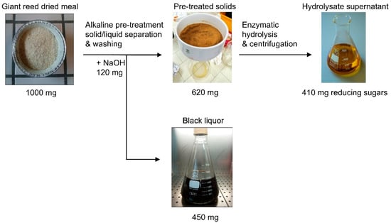 The different steps of the dry giant reed meal treatment from the alkaline pre-treatment up to the enzymatic hydrolysis are illustrated in Figure 1.