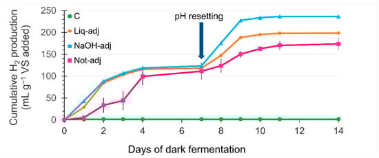 Measurements of the cumulative H2 production per gram of volatile solids during dark fermentation of differently prepared giant reed hydrolysates: Not-adj (not adjusted initial pH 5.3, pink squares); NaOH-adj (NaOH-adjusted initial pH 8.7, blue triangles); Liq-adj (black liquor-adjusted initial pH 8.7, orange diamonds); C (not treated and not hydrolyzed giant reed control, NaOH-adjusted initial pH 8.7, green circles). The downward vertical arrow indicates the time of pH resetting of all reactors to their initial value with NaOH or black liquor depending on the treatment. Vertical bars represent the standard deviation (n = 3).