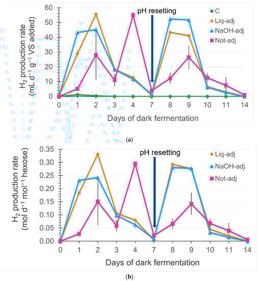 The maximum daily rate of H2 production (max Rate) was 56, 52 and 55 mL H2 STP d−1 g−1 VS, respectively, for Liq-adj, NaOH-adj, and Not-adj reactors, with a significant increase, compared to C: notably, the highest max Rate was observed for Liq-adj reactors, and it was significantly higher compared to that of NaOH-adj reactors.