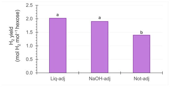Cumulated H2 production per mole of hexose from giant reed hydrolysates with different initial pH.; Liq-adj: black liquor-adjusted initial pH 8.7; NaOH-adj: NaOH-adjusted initial pH 8.7; Not-adj: not adjusted initial pH 5.3; Means with different letters differ significantly at p < 0.05 according to Tukey’s Honestly Significant Difference test.