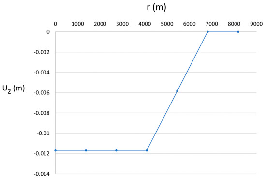 The maximum pressure drop was assumed to be 3.43 × 106 Pa. Therefore, the vertical displacement uz versus the radial distance from the axis is shown in Figure 4, where the maximum subsidence is nearly equal to 12 mm.