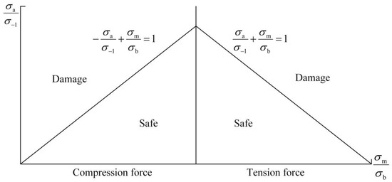 The S–N curve of the material is obtained under the specified stress ratio . Under the specified life cycle, the conditional fatigue limit under different stress ratios can be obtained according to the modified Goodman curve equation [18,19,20,21]. The Goodman curve is shown in Figure 1: