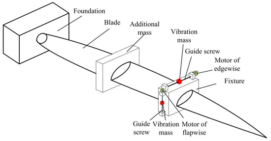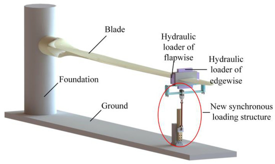 Loading approaches of wind turbine blades can be divided into forced displacement type and resonance type [28,29,30,31]. In the forced displacement loading mode, hydraulic loaders are generally used to drive the blades to move forcibly. In the resonant loading mode, certain masses are usually added to the blades to adjust bending moment distribution and natural frequency, while vibration exciters are used for loading.