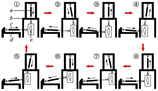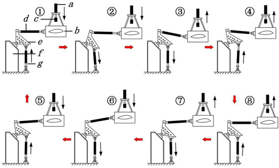 Movement process of blades in a single cycle when using hybrid biaxial fatigue testing device. a is hydraulic loader of flapwise, b is cross section of blade and fixture, c is hydraulic rod and vibration mass, d is push rod, d is push rod, e is rocker arm, f is foundation, g is hydraulic loader of edgewise.