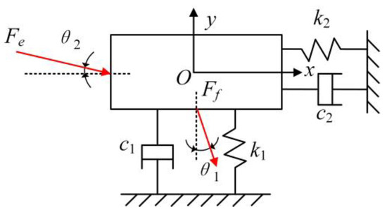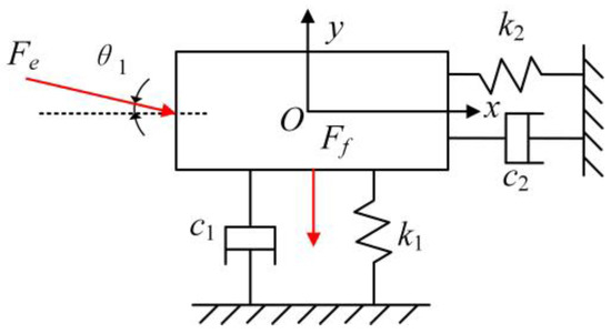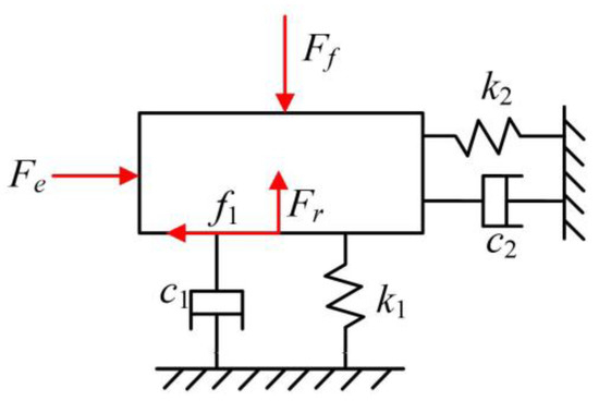 According to the equivalent principles of mass, damping, and stiffness in mechanical vibration [33,35], the equivalent model of a blade testing system can be established as shown in Figure 11 and Figure 12 Here, the virtual mass block, edgewise hydraulic loader, and sliding platform are simplified as sliding devices. According to the force analysis, it can be deduced that:
