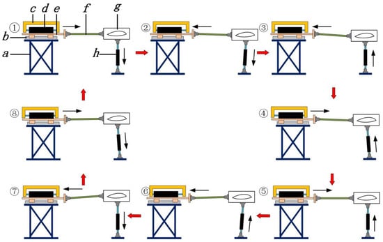 Movement process of blades in a single cycle when using “virtual-mass” biaxial fatigue testing device. a is foundation, b is slide rail, c is virtual mass, d is hydraulic loader of edgewise and piston rod, e is slide platform, f is push rod, g is cross section of blade and fixture, h is hydraulic loader of flapwise.