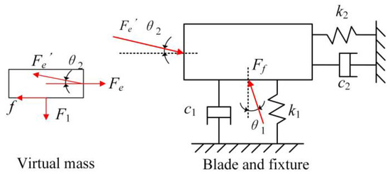 According to the equivalent principles of mass, damping, and stiffness in mechanical vibration [33,34], the equivalent model of blade testing system can be established as shown in Figure 7. According to dynamic analysis, the following equations can be deduced:
