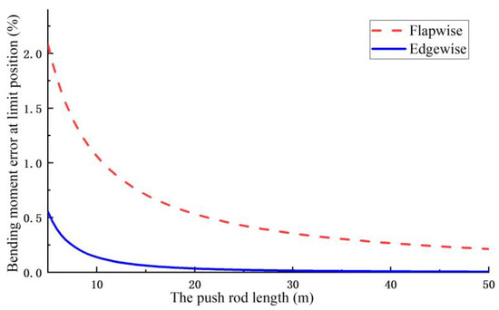 Take a 60 m-long blade as an example to calculate. , , , and of the edgewise blade are 1.08 m, 518.5 kN·m, 3852 kN·m, and 5250 kN·m, respectively. Because the amplitude of the flap-wise blade is 3.69 m, the rod length must be greater than 3.69 m to prevent the blade from colliding with the guide rail. According to the above data, the variation trend of the bending moment error in both directions at the limit position with the increase in rod length is shown in Figure 13.