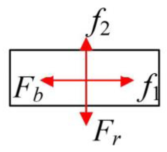 where is the force exerted on the blade by the flap-wise hydraulic loader, is the force exerted on the blade by the edgewise hydraulic loader, is the force exerted by the push rod on the sliding device, is the friction force between the sliding device and the slide rail, is the supporting force of the slide rail on the sliding device, is the angle between the flap-wise force and the vertical direction, is the angle between the edgewise force and the horizontal direction, and and are the displacements of the edgewise and flap-wise blades, respectively. and are the flap-wise and edgewise damping, respectively. and are the stiffnesses of flap-wise and edgewise blades, respectively. is the mass of the slide device, and is the blade mass with the fixture.