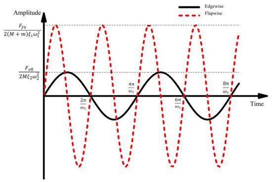 where and are the amplitudes of the flap-wise force and the edgewise force, respectively, is the flap-wise force loading frequency, is the edgewise force loading frequency, is the flap-wise natural frequency, and is the edgewise natural frequency. and are the maximum amplitudes at the flap-wise and edgewise blade excitation point, respectively. are the push rod lengths of the flap-wise and edge-wise hydraulic loader’s length, respectively.