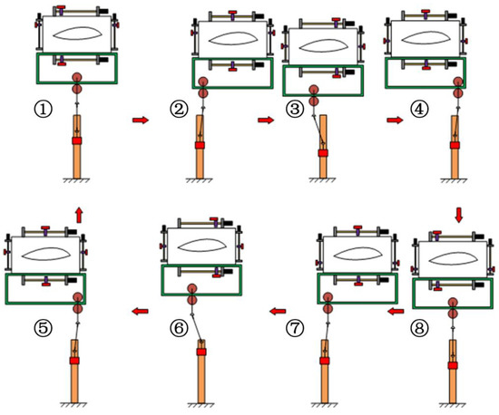 The world’s earliest biaxial fatigue testing device is forced displacement type, which was put forward by D.R.V.Van et al. of Delft University of Technology in the Netherlands in 1986 [28]. As shown in Figure 6, the force decoupling device consists of support frames, a flap-wise hydraulic loader, an edgewise hydraulic loader, a fixture, etc. Because the piston rod is fixedly connected with the blade through the fixture, the hydraulic loader forcibly drives the blade to reciprocate during the test. In one cycle, the direction change of the acting force of flap-wise hydraulic loader and edgewise hydraulic loader on the blade is shown in Figure 6. Under the constantly changing outside force, the blade position experiences the movement process of 1-2-3-4-5-6-7-8-1.