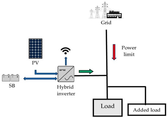The demand for the use of hybrid PVS with SB is confirmed by the fact that the electrical market is widely represented by various solutions of hybrid inverters [,], which are designed for LO. They have all the equipment for connecting a photovoltaic battery (PV) and SB, as well as sufficiently powerful software. They are designed for self-consumption of LO while reducing consumption from DG, and they provide an uninterruptible power supply function.