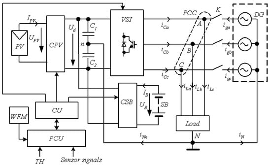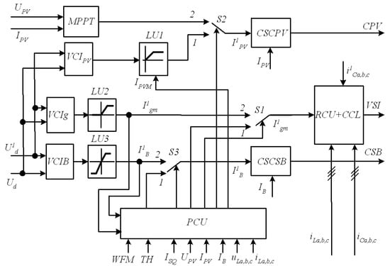 A simplified structure of the PVS control system is shown in Figure 4. The system of automatic control of the CU converter unit is implemented according to well-known principles with voltage stabilization in the DC link Ud at the VSI input [,]. This is provided by three proportional–integral (PI) voltage controllers (VCs): VCIPV forms the PV current reference; VCIB forms the SB current reference; VCIg forms the reference of the current at the point of common coupling to the grid. The system (Figure 4) contains three channels: