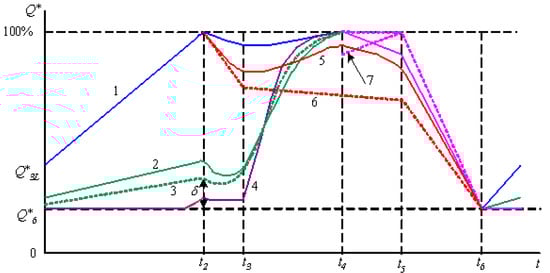 Reference to the initial value Q*2R is carried out in accordance with values ΔQ*23 and ΔQ*24 (calculated similarly to Equation (8)). If ΔQ*24 ≤ 0, then Q*2R = 100% (curves 1, 5, and 6 in Figure 3). In this case, when ΔQ*24 > 0 and ΔQ*23 ≤ 0, then Q*2R = (100 − ΔQ*24) ≥ 40% (curve 2 in Figure 3). If ΔQ*24 > 0, ΔQ*23 > 0, and WPV23 · ηC/W1C23 < 1.5 (W1C23 is the value for the basic schedule with given ρ), then Q*2R = (100 − ΔQ*24) ≥ (Q*6 + δ) (curve 3 in Figure 3, δ = 10–15%). In all cases, the reference of the added power is PC23 = P1C23.