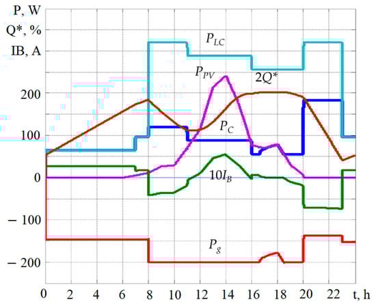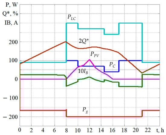 If ΔQ*24 > 0, ΔQ*23 > 0, and WPV23 · ηC/W1C23 ≥ 1.5, then PLC23 ≥ (PC23 = PPV23 · ηC) ≥ P1C23, which is given in accordance with PV generation. In this case, the SB charge (curve 4 in Figure 3) is not carried out. It also does not use the battery charge at night, but there may be some battery charge before 8:00 a.m. (sunny morning).