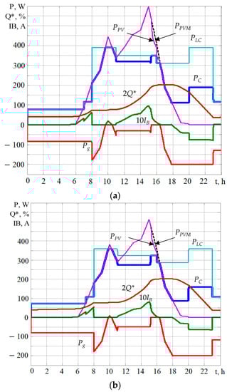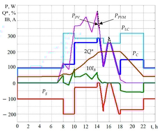 The battery charge when Q* ≥ Q*d = 90–92% is reached at a constant value of the voltage []. In this case, the battery current is determined by the charge curve and is significantly reduced. Thus, the ability of the SB to receive energy is limited. Therefore, when Q* ≥ Q*d, the value of PC is set according to the actual PV generation as PLC ≥ PC = (PPV · ηC − PB) ≥ P1C. The limitation PLC ≥ PC is implemented by reducing the PV generation. The introduction of this mode allows ensuring more complete use of the PV energy, particularly when the calculated value of PC34 is less than required.