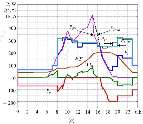 Figure 7. Oscillograms PLC, PLCR, PC, PPVM, PPV, , IB, and Pg for the May day with a generation corresponding to the monthly average ( and IB values are shown at scale 2 and 10, respectively): (a) PLC = PLCR, PPVR = 1 kW, WB = 968 Wh, and at limit values ρ = 1.95 with kE = 2.618; (b) PLC = PLCR, PPVR = 0.86 kW, WB = 800 Wh, and at limit values p = 1.8 with kE = 2.356; (c) PLC ≠ PLCR, PPVR = 0.86 kW, WB = 800 Wh, and p = 1.6 with kE = 2.795. - In Figure 7b for the May day with the generation, corresponding to the average monthly values at PLC = PLCR, PPVR = 0.86 kW, WB = 800 Wh, and at limit values p = 1.8 with kE = 2.356;