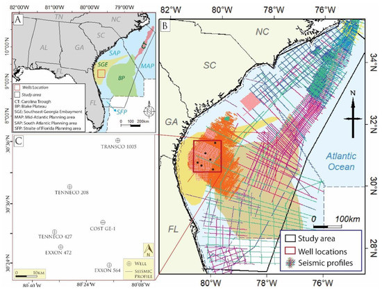 Seven commercial exploratory offshore wells (GETTY 913, TRANSCO 1005-1-1, TENNECO 208, COST GE-1, TENNECO 427, EXXON 472, and EXXON 564-1) (Figure 1C) were drilled in the Southeast Georgia Embayment from 1979 to 1980. These wells were stratigraphically correlated by Poppe et al. [25], and have also been seismic-stratigraphically interpreted and correlated with similar Mesozoic sedimentary sequences [30]. TRANSCO 1005-1, COST GE-1, and EXXON 564-1—the deepest three wells in the Southeast Georgia Embayment—were used in the present study. TRANSCO 1005-1 and COST GE-1 are the only two wells that penetrate the pre-rift sedimentary sequences from the Paleozoic Era. The EXXON 564-1 well penetrates only the post-rift sedimentary sequence from the Mesozoic Era.