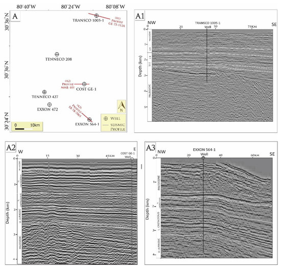 Seismic-well tie analysis for three wells: (A) The location map of the commercial wells in the Southeast Georgia Embayment. (A1) The seismic profile Number GE-75-112A intersecting the TRANSCO 1005-1-1 well. (A2) The seismic profile Number MME-101 intersecting the COST GE-1 well. (A3) The seismic profile Number E8-78-7065 intersecting the EXXON 564-1 well.