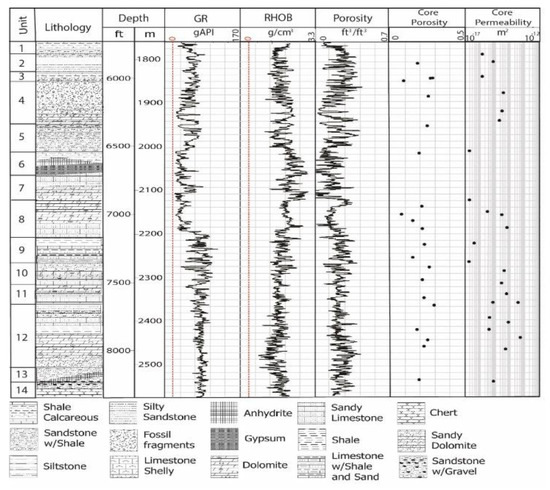 The 14 lithological intervals of the Lower Cretaceous strata, between depths of 1798 and 2195 m in the COST GE-1 well, based on [9]. Adapted with permission from Ref. [9]. Copyright 1979, copyright Scholle.