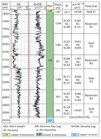The Lower Cretaceous strata, between depths of 1798 m and 2195 m, have 14 lithological intervals, which are mainly composed of varying proportions of calcite, clay, shale, sandstone, limestone, and dolomite with carbonite materials [9] (Table 2).