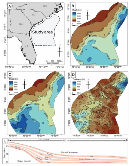 Offshore geologic storage of carbon dioxide (CO2) as a form of carbon capture and storage (CCS) technology has recently attracted considerable scientific attention. CCS technology is a potentially vital tool to reduce the levels of CO2 emissions in the atmosphere and to prevent the most dangerous consequences of climate change [1,2,3,4,5,6,7,8]. The term offshore CO2 storage refers to the injection of CO2 into the geological strata beneath the seabed for safe and permanent storage [9,10,11,12]. Due to legal considerations and the vast resource storage capacity, offshore storage offers an attractive alternative to the onshore options. After many failed attempts, the Sleipner project in the North Sea was an early successful opportunity for commercial deployment of CO2 storage. Although offshore Lower Cretaceous reservoirs have an extensive expected storage capacity, there has been no comprehensive assessment of the offshore storage resource estimate in the southeastern United States. An analysis of a 25,900 km2 area of offshore Alabama and the western Florida Panhandle suggested that approximately 170 Gt of CO2 could be stored in Miocene sandstone, whereas at least 30 Gt could be stored in the deeper Cretaceous formations [13]. Around 32 Gt of CO2 could be stored within 190,000 km2 of the Upper Cretaceous strata in the offshore southeastern United States [14]. A study offshore of the northeastern United States has recently concluded that the Cretaceous and Jurassic sandstone is able to store approximately 37–403 Mt of CO2, with geological storage efficiency of 1–13% [15]. Realizing that the US Environmental Protection Agency estimates that about 40% of anthropogenic CO2 emissions in the US are produced in the southeast, the lack of an offshore CO2 assessment constitutes a significant gap in understanding of this prospective regional storage resource [16,17,18,19].