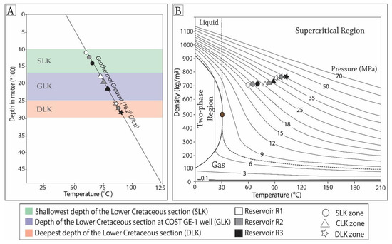 (A) The three reservoirs in three depth zones plotted in the geothermal gradient at the COST GE-1 well. (B) The time–depth–pressure graph to identify the density of supercritical CO2 for three reservoirs in the three depth zones of the Lower Cretaceous section.
