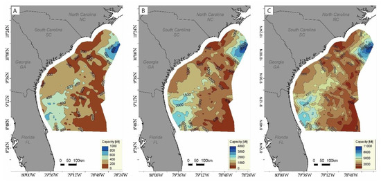 We developed an estimate of the regional CO2 storage capacity offshore of the Lower Cretaceous section in the Mid–South Atlantic Ocean using the US Department of Energy (DOE) National Energy Technology Laboratory (NETL) method [16,34,35].