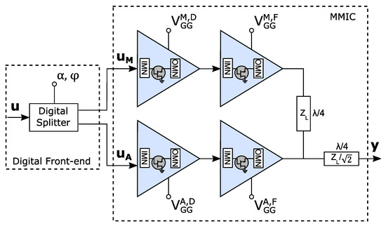 The DIDPA here under analysis is designed exploiting the Win Semiconductors NP15-00 150 nm GaN process manufactured on 100 mm SiC wafers. This process is well suited for mm-wave high-power applications featuring GHz. The breakdown voltage exceeds 100 V thanks to a source-coupled field plate. At 28 V operation, the maximum power density is 4 W/mm at 29 GHz. The DIDPA block diagram is shown in Figure 1, while its layout is shown in Figure 2. A two-stage amplification is used to target 25 dB of gain at 24 GHz. The devices of the driving stage are 2 × 75 m HEMTs whereas, in the final stage, 6 × 75 m HEMTs were used both for the main and the auxiliary PAs. The nominal drain voltage is = 28 V for all the stages. In Figure 2, it is possible to visualize the asymmetry of the output combiner that provides the required 90-degree phase shift in the combination of the output signals. The chip dimensions are 3.8 mm × 4.2 mm.