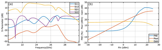 The performance of the DIDPA enforcing the nominal input split and bias by applying the values from Table 1 (thus resulting in this case in a classical single-input DPA) is shown in Figure 3a,b, which respectively display the S-parameters and the continuous-wave (CW) large-signal characteristics. With a peak PAE of 40% and PAE of 30% at 6 dB of output backoff, the performance of the presented PA is in line with similar K-band high-gain (two-stage) DPAs found in the literature, e.g., [16,17,18].