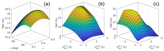 In addition, the same flow chart can also be iterated. Thus, as further tested, we considered the order achieving the best PAE in the first iteration, namely (,) → (,) → (,), and left it iterating until no incremental improvement could be seen between two successive iterations. In Table 4, we compare the results between the case with only one iteration and the iterative case (six iterations in total, with a proportional number of PAE evaluations involved), reporting only a small increment in PAE. It is worth highlighting that the retrieval of the PAE value for a given set of input variables corresponds to the evaluation of the quasi-static PAE expression in (2), which is very quick in a classical PC simulation environment (in the order of a few seconds), thus making it feasible to realize the high number of PAE evaluations as the ones reported in Table 4.