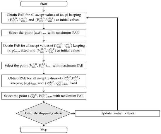 Figure 5 displays the flow chart for the CD algorithm applied to the quasi-static AM/AM–AM/PM SUMO and aimed at the maximization of the PAE metric as defined in (2). In the depicted flow chart, the sequence and selection of variables for optimization is fixed in the order (,) → (,) → (,). However, any other different permutation could be adopted (see below).