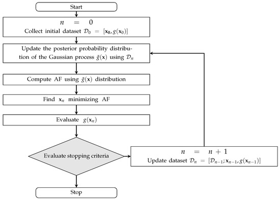 Figure 6 outlines the basic steps of the adopted algorithm. At every iteration n, the method extracts the Gaussian process used as SUMO from the dataset , which is the collection of all the evaluations of the objective function at that iteration. Then, it selects the point that should be evaluated next by minimizing the AF. At the end of every iteration, the method evaluates the exit conditions, which in this case are set as a maximum number of iterations without an improvement of the objective function.