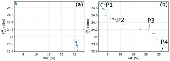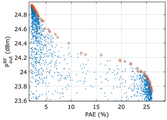 It is of clear interest for PA application to optimize not only the PAE (single-objective optimization), but the compromise between PAE and RF output power. Table 4 highlights a trade-off between PAE and , since the points found optimizing the PAE show a lower level of . In order to preliminarily visualize such a trade-off for the DIDPA under study, Figure 7 reports an extensive sampling of the variables’ space from a high number of evaluations of the quasi-static SUMO, reporting the ILC-based linearized performance on the 2D plane of the objectives. The solution points highlighted with red circles identify the non-dominated points (Pareto frontier) representing best PAE–RF output power trade-offs.