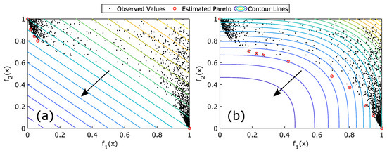 Estimated optimal points (red circles) in a non-convex Pareto frontier with different FoM combinations with contour lines of the combined objective function for . (a) Linear combination (), (b) non-linear combination (). The arrows indicate the combined minimization of the two scaled FoMs.