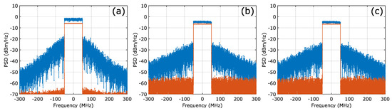 Spectra of the output RF signal before (blue lines) and after linearization (red lines) with PA parameters at (a) nominal values, (b) after coordinate descent (iterated) optimization, and (c) after Bayesian optimization (P4).