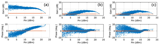 PA gain and AM/PM characteristics before (blue lines) and after linearization (red lines) with PA parameters at (a) nominal values, (b) after coordinate descent (iterated) optimization, and (c) after Bayesian optimization (P4).