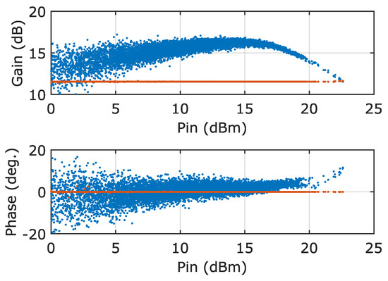 PA gain and AM/PM characteristics before (blue lines) and after linearization (red lines) at optimal point P3.