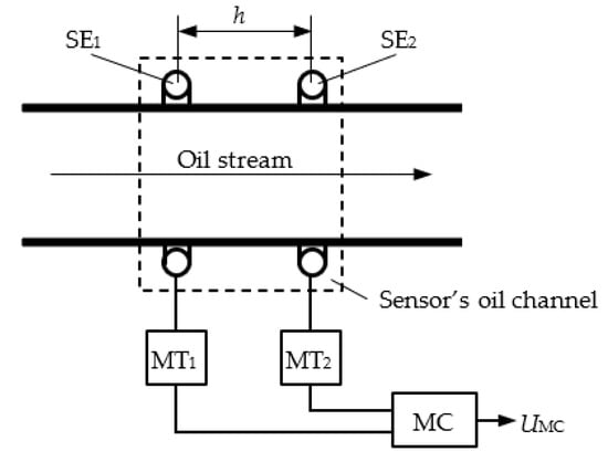 Two SE installed in the same sensor’s oil channel at a fixed distance from each other also provide an assessment of the oil stream rate in the lubrication system of a power plant. The weight of the particles is assumed to be small, and it is accepted that they move at a stream rate. In this case, the oil stream rate is determined by calculating the time interval (Δ