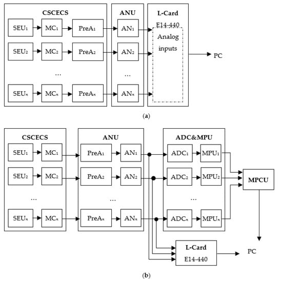 Figure 4a,b also differ by means of analog-to-digital conversion and secondary processing of SCECS signals. The first variant of the DCMS prototype (