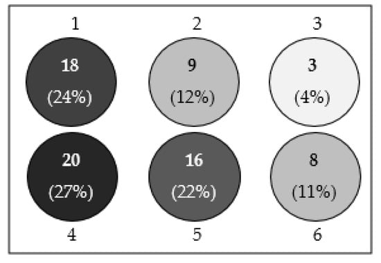 Figure 6 demonstrates the distribution of the metal particles fixed by the DCMS over the oil channels of the CSCECS during the test period. The absolute number of the detected particles in each specific channel of the CSCECS is marked by numerals, and the filling indicates a relative frequency of their appearance in the channel (the darker tone corresponds to more often detection of the particles in the sensor’s channel). As shown in