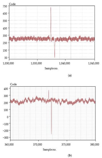 35], which is more resistant to the extrema dispersion than the traditional approaches. The additional analysis of the system’s spurious alarms is carried out at the same stage. It is based on the diagnostic property of the existence of two identical in amplitude, but opposite in phase signals after the time corresponding to the passage of a metal particle of the distance between the working and the compensation SE. If the opposite signal has been detected, the previously determined value of the digital code is fixed in the system memory together with the time stamp of its appearance. Otherwise, the detection result is discarded as false.