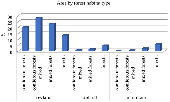 The methodology of this study took into account the harvesting level of the selected wood biomass assortments based on data from the State Forests and the Central Statistical Office (GUS). At the same time, the potential wood processing companies, which process more valuable wood raw material, were indicated as suppliers of biomass as a by-product. The study of the influence of regionalisation on the level of forest biomass generated was based on data obtained from the areas managed by the General Directorate of State Forests in Poland. As of 1 January 2020, the area of forests was 9,258,800 ha, including 9,462,900 ha of forest land (Report on the State of Forests in Poland 2020 [29]). This study was conducted on an area with various forms of nature conservation, including national parks and Natura 2000 sites. Figure 1 shows the percentage of individual types of the forest habitat.