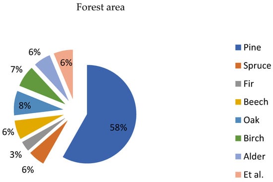 In the habitat structure of forests, deciduous forest habitats slightly predominate, occurring in 50.2% of the forest area; coniferous habitats occupy 49.8%. In both groups, there are also upland habitats, covering a total of 6.7% of the forest area, and mountain habitats, occurring on 8.5% of the area. Coniferous species predominate in 68.4% of Poland’s forest area (Figure 2). They are also the main source of forest biomass. The share and form of biomass materials depends on the maturity and quality of the raw wood harvested.