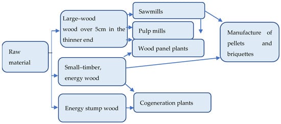 At the same time, due to the increasing intensity of industrial development, the share of wood by-products is growing. The increased use of biomass is influenced by the greater demand for renewable energy, which generates the demand for environment-friendly products. In many countries around the world, there is a growing demand for natural resources, including biomass, in the power industry. The results of scientific research and the recent directives of the Paris Agreement [12] cause the need to implement radical changes in this area. These changes are implemented on the basis of new legal regulations [13], as well as the decisions and actions taken by manufacturers, who follow the circular economy model, as they try to maximise the use of available raw materials in the production process [14,15]. Many wood-processing institutions and entities follow the trend of the maximised use of renewable resources [16,17]. The wood industry also makes the maximum use of raw materials in the production process. It also applies the solutions aimed at the complete use of the by-products as biomass. Due to the nature of wood production, waste and by-products originating from a particular enterprise can be used as biomass in this entity or in other branches of the industry [18]. The efficient use of resources such as wood harvesting materials and remains extends the total availability of biomass in the wood industry. In practice, this means that not only forest biomass but also wood biomass are reusable by-products [19,20,21]. In consequence, round wood can be used more rationally [22,23]. In the circular economy model, which is used in wood enterprises, a large part of the biomass is marketed (sold to other wood enterprises) or used to supply energy [24,25,26]. In-house biomass management translates directly into the production of briquettes and pellets or direct combustion, which has economic and environmental effects. Therefore, it is important to determine the share of by-products with the lowest possible environmental effect at all stages of the processing, finishing, and preparation of the wooden elements. The sawmill industry has the greatest potential in this area. Elemental wood processing involves the processing of raw material into finished products, as well as by-products, which can be used to supply energy due to their considerable comminution. Sawmills need to apply the wood-processing solutions that enable the use of raw material while minimising the generation of by-products in the form of processed biomass. The aim of these activities is to continuously optimise the production process and flexibly adapt to the current needs of the market economy. In most cases, enterprises only provide biomass for the production of boards, as well as bio-fuels or thermal energy for technological purposes (drying timber, heating production rooms, etc.). When the enterprise has satisfied its demand for energy, it can sell the surplus of biomass to local recipients. These solutions enable the local community to directly use the heat or energy generated from renewable fuels, and thus, the negative influence on the environment is reduced. Biomass produced in sawmills is becoming an increasingly important source of heat and electricity in European countries. The widespread implementation of the use of biomass in sawmills improves the socioeconomic and environmental aspects [27,28].