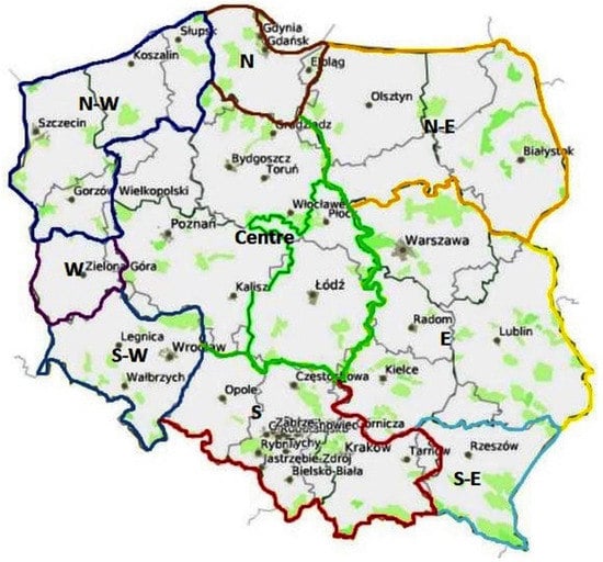 Between 2010 and 2018, the amount of wood harvested tended to increase (Figure 4), which resulted in an increasing share of wood biomass in this period. The amount of wood harvested between 2017 and 2019 was affected by the damage ‘the hurricane of the century’ caused to large forest areas in 2017. An additional volume of 8.5 million m3 of wood was harvested (Report on the State of Forests 2019 [38]). As results from the data in Figure 4, the largest amount of wood was harvested in Poland in 2018. After that year, the amount of wood harvested tended to decrease gradually. This period can be assumed as the starting point for the verification of wood biomass resources. The directions of wood biomass production largely depend on the regionalisation in Poland. As the supply of biomass is limited by the costs of transport, it is economically justified to process a biomass as close to the place of its acquisition as possible. Regionalisation based on the division of Poland according to geographical directions was adopted in the research methodology. The administrative division of the Regional Directorate of State Forests was taken into account (Figure 5).