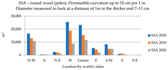 Class S3A wood (Figure 7), which can be mainly industrially processed and can also be the basis for energy biomass, has a similar role. The total amount of this wood harvested annually does not exceed 83,000 m3. It is not dominant in the forest biomass market. The distribution of the amount of the S3A biomass harvested from individual regions in Poland is similar to that of the M1 biomass.